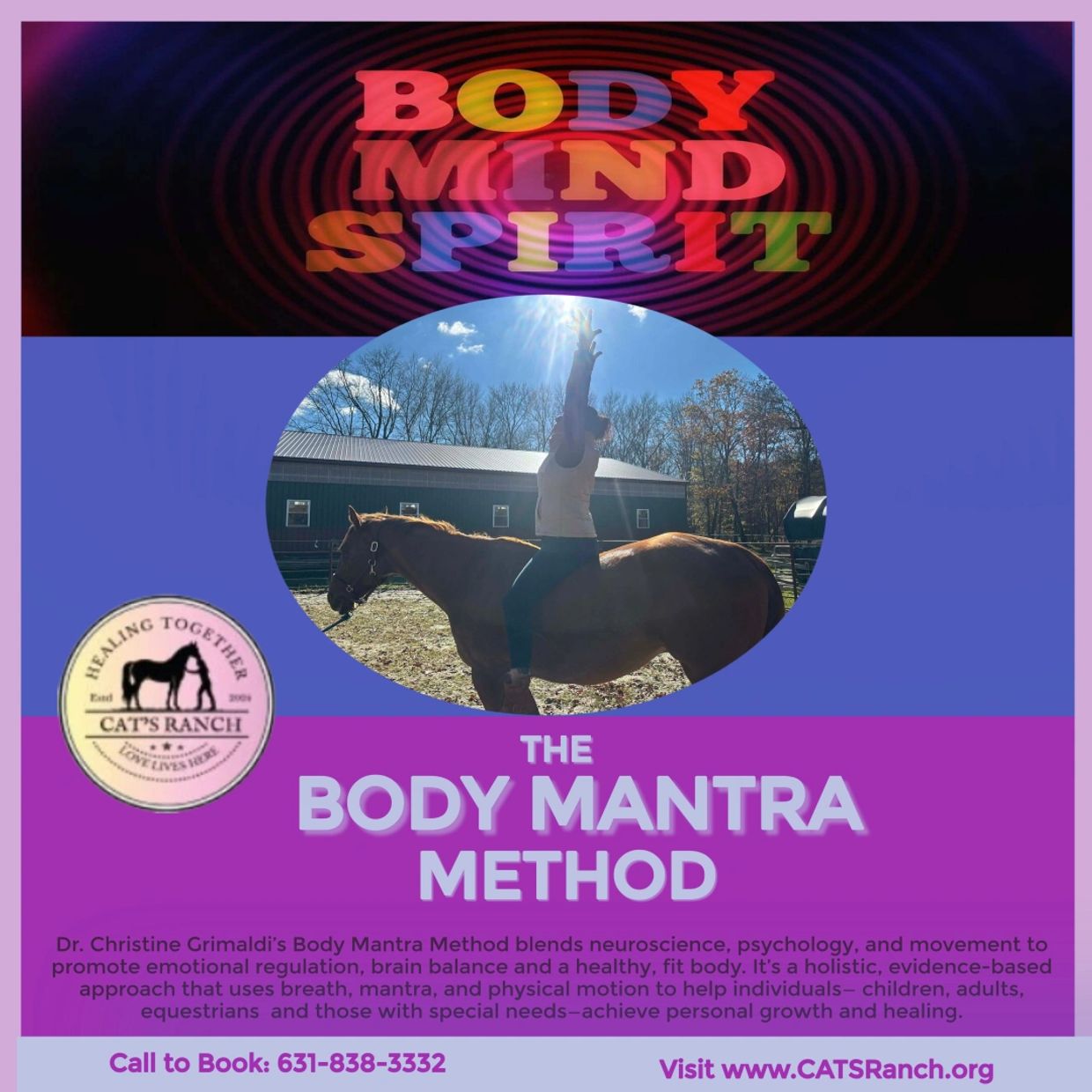 The Body Mantra Method is practiced on a specialized mat, specialized hammock, with horses or an equine simulator and often includes music. Private and group sessions are available by appointment.